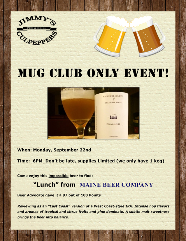 Mug Club Event, Tuesday September 22nd: Come enjoy a special beer from Maine Brewing “Lunch”